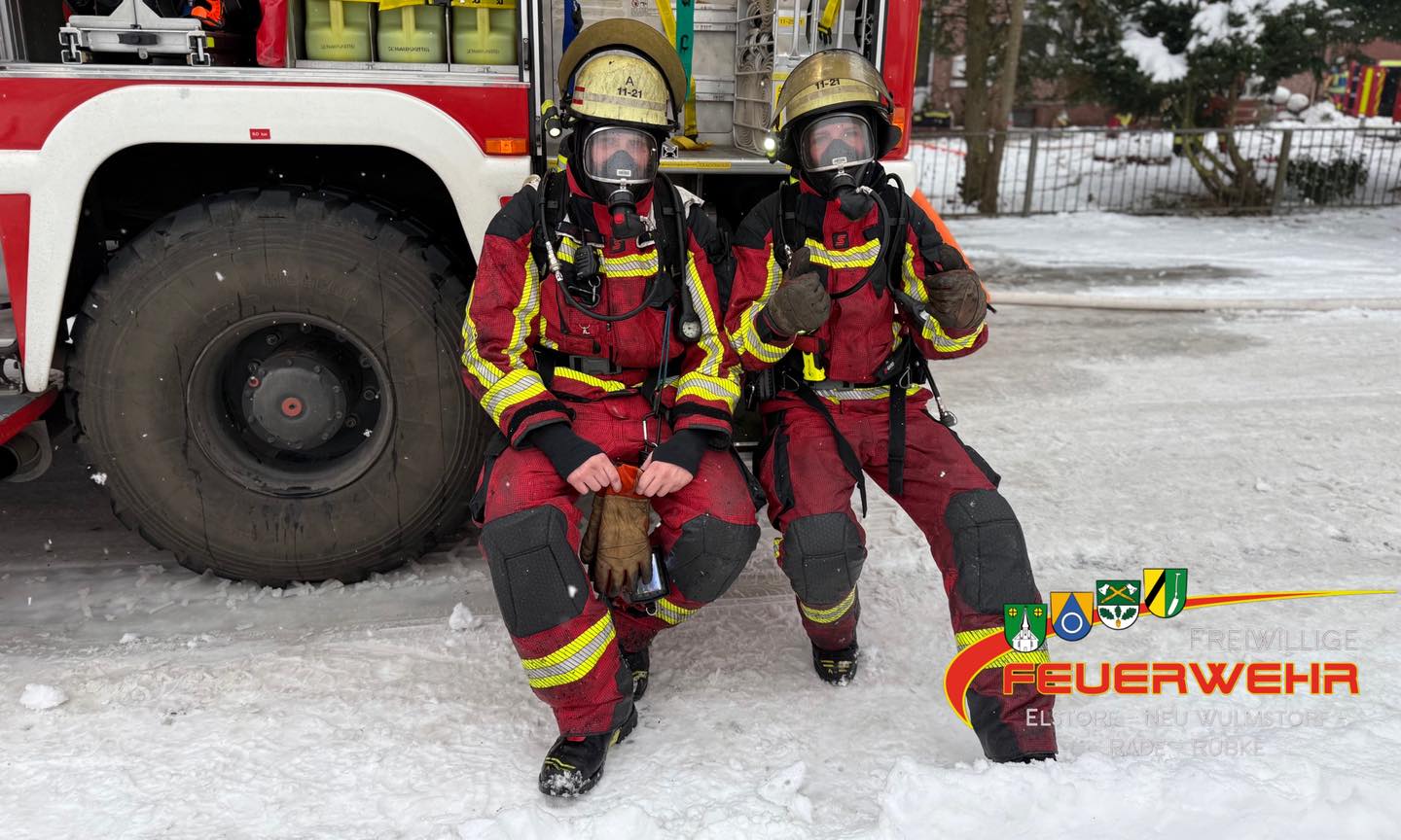 Umgehend wurde eine Brandbekämpfung eingeleitet. Ein erster Trupp – zwei Feuerwehrleute – ging unter Atemschutz zur Brandbekämpfung in die Wohnung. Die Wohnung war vollständig mit tiefschwarzem Rauch gefüllt. Zeitgleich wurde, durch die kurz danach eintreffende Ortsfeuerwehr Neu Wulmstorf über einen Balkon auf der Rückseite des Gebäudes, ein zweiter Trupp zur Brandbekämpfung geschickt.