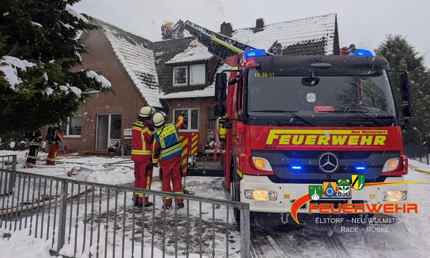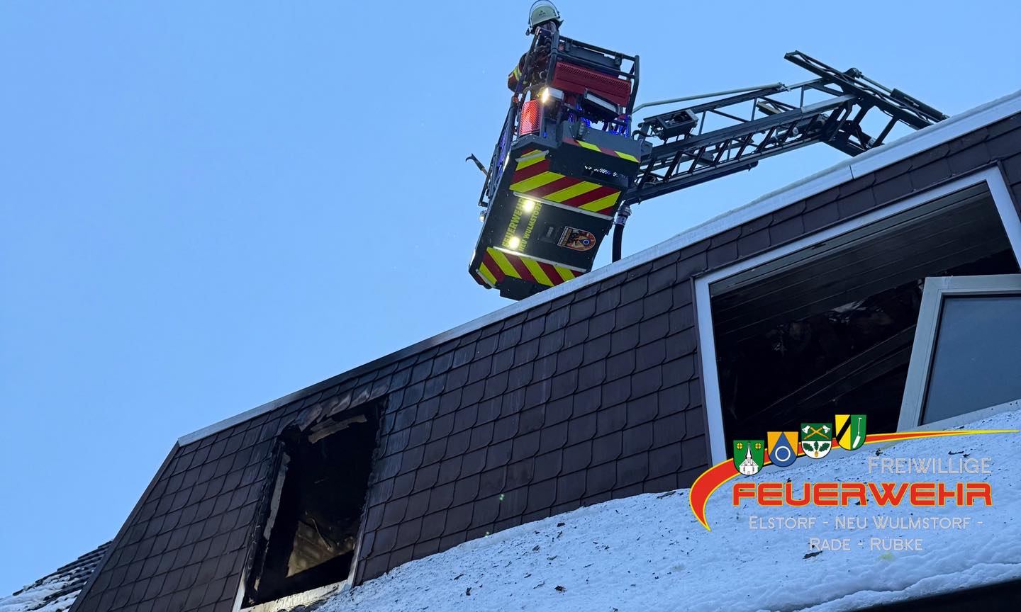 Über die Neu Wulmstorfer Drehleiter wurde das Dach an mehreren Stellen geöffnet, um zu kontrollieren, ob das Feuer auf den Dachstuhl übergegriffen hat. Durch das zügige Eingreifen unserer Einsatzkräfte konnte dies jedoch verhindert werden. Nach ca. 2,5 Stunden konnte der Einsatz langsam zurückgebaut werden. Aufgrund der Witterung streute der Bauhof mehrfach die Straße, welche aufgrund von Löschwasser bereits begonnen hatte zu gefrieren. Die Atemschutzgeräteträger konnten sich im Schutz vor der Witterung in einer Garage eines angrenzenden Wohnhauses unterstellen – vielen Dank dafür!