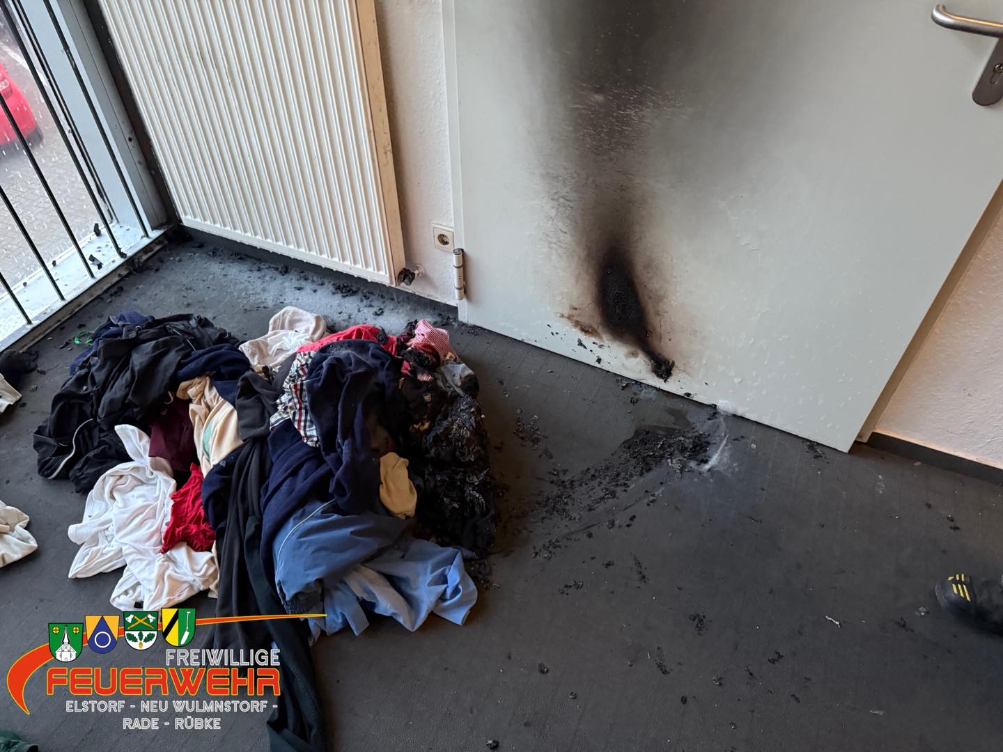 Wir kontrollierten die Reste des Haufens auf Glutnester und brachten sie nach draußen. Das Treppenhaus und angrenzende Räume wurden von uns belüftet.