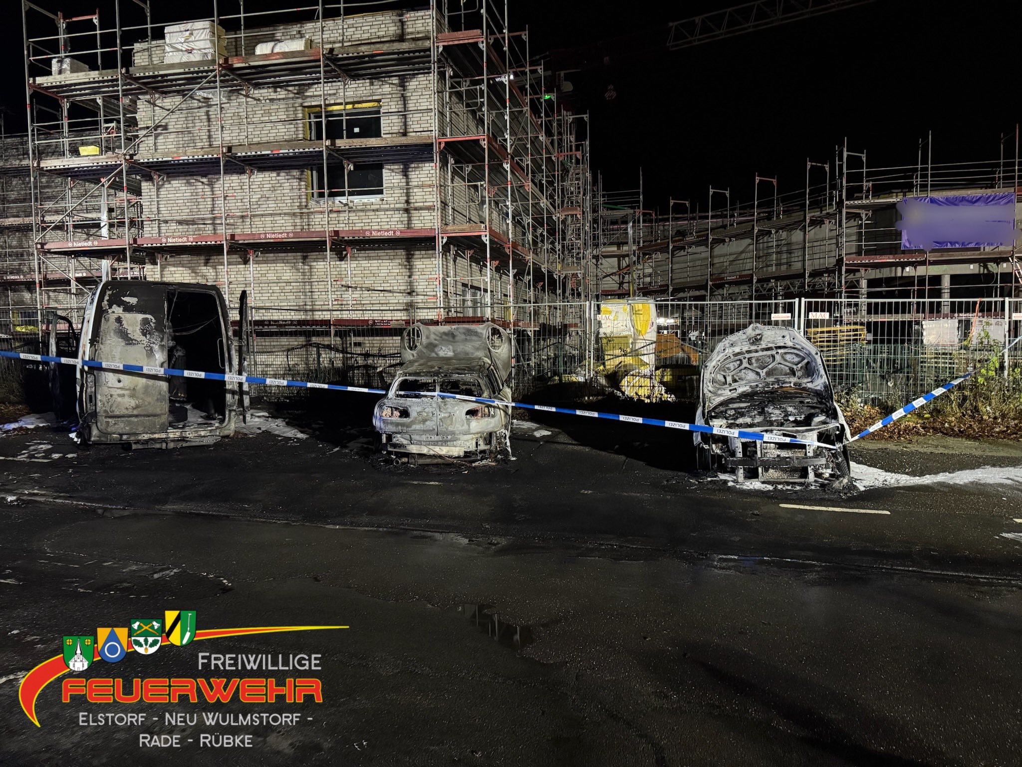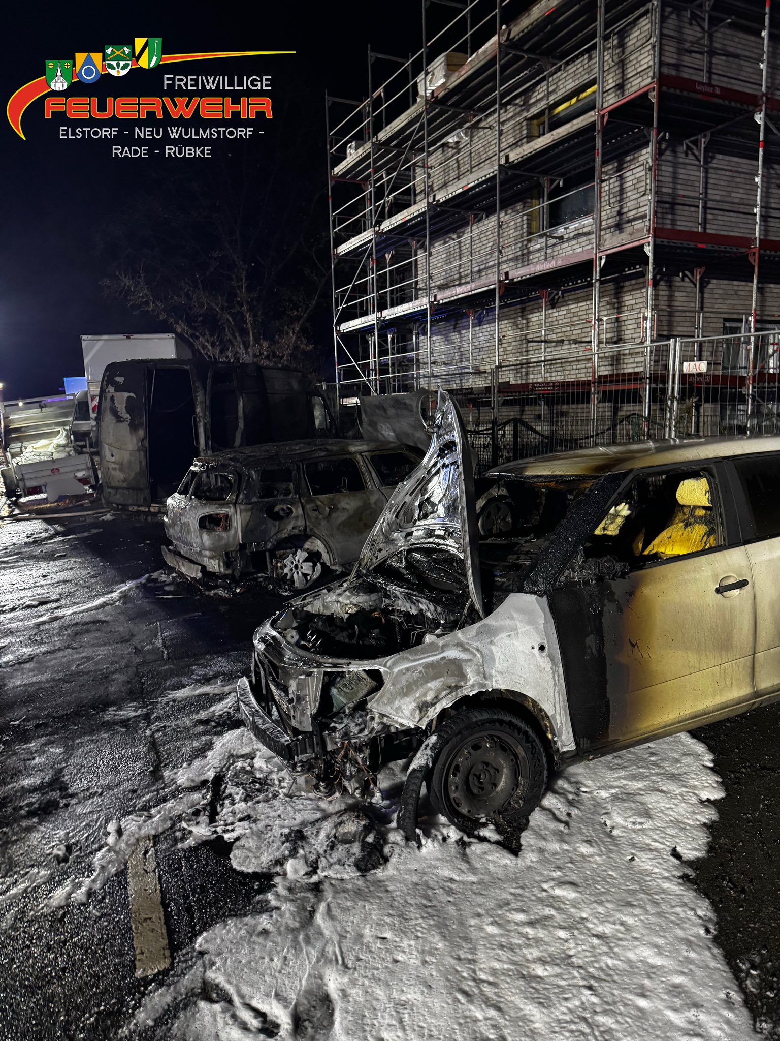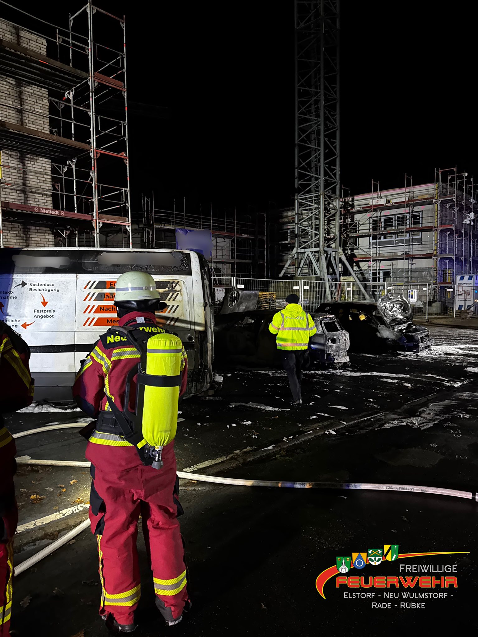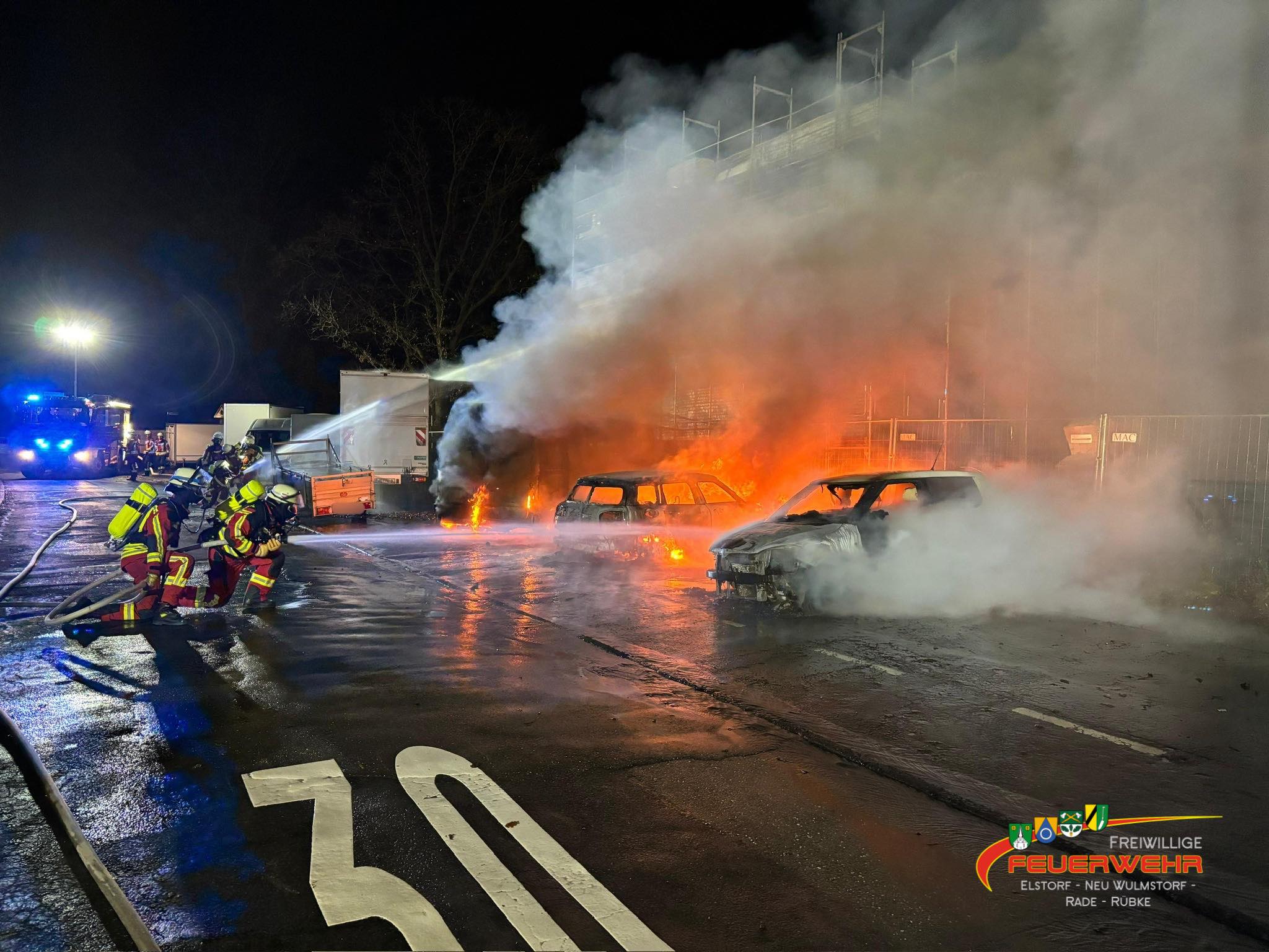 Beim Eintreffen an der Einsatzstelle brannten drei Fahrzeuge sowie eine etwa 20 Meter lange Benzinspur – ausgehend von einem der Fahrzeugtanks. Die Benzinspur konnte schnell abgelöscht werden, jedoch führte die starke Wärmestrahlung dazu, dass der Angriffstrupp den Auftrag erhielt, den Neubau der Grundschule „An der Heide“ zu schützen und die Außenwand zu kühlen. Ein angrenzender Anhänger begann im Bereich eines Reifens zu brennen, konnte weggezogen und dadurch teilweise gerettet werden.