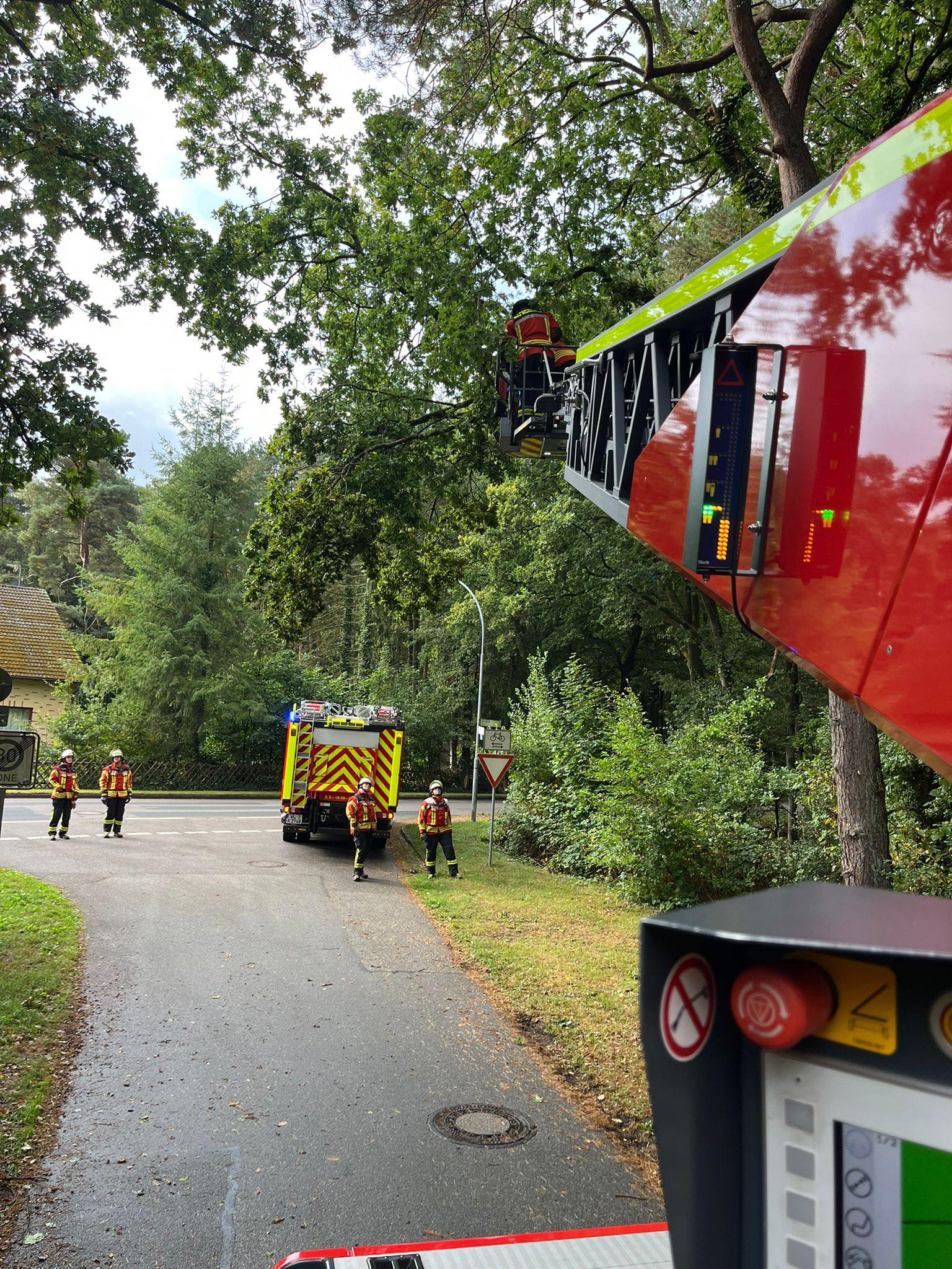 Mittels Drehleiter wurde der Ast kontrolliert entfernt, sodass keine Gefahr für den Straßenverkehr mehr bestand.