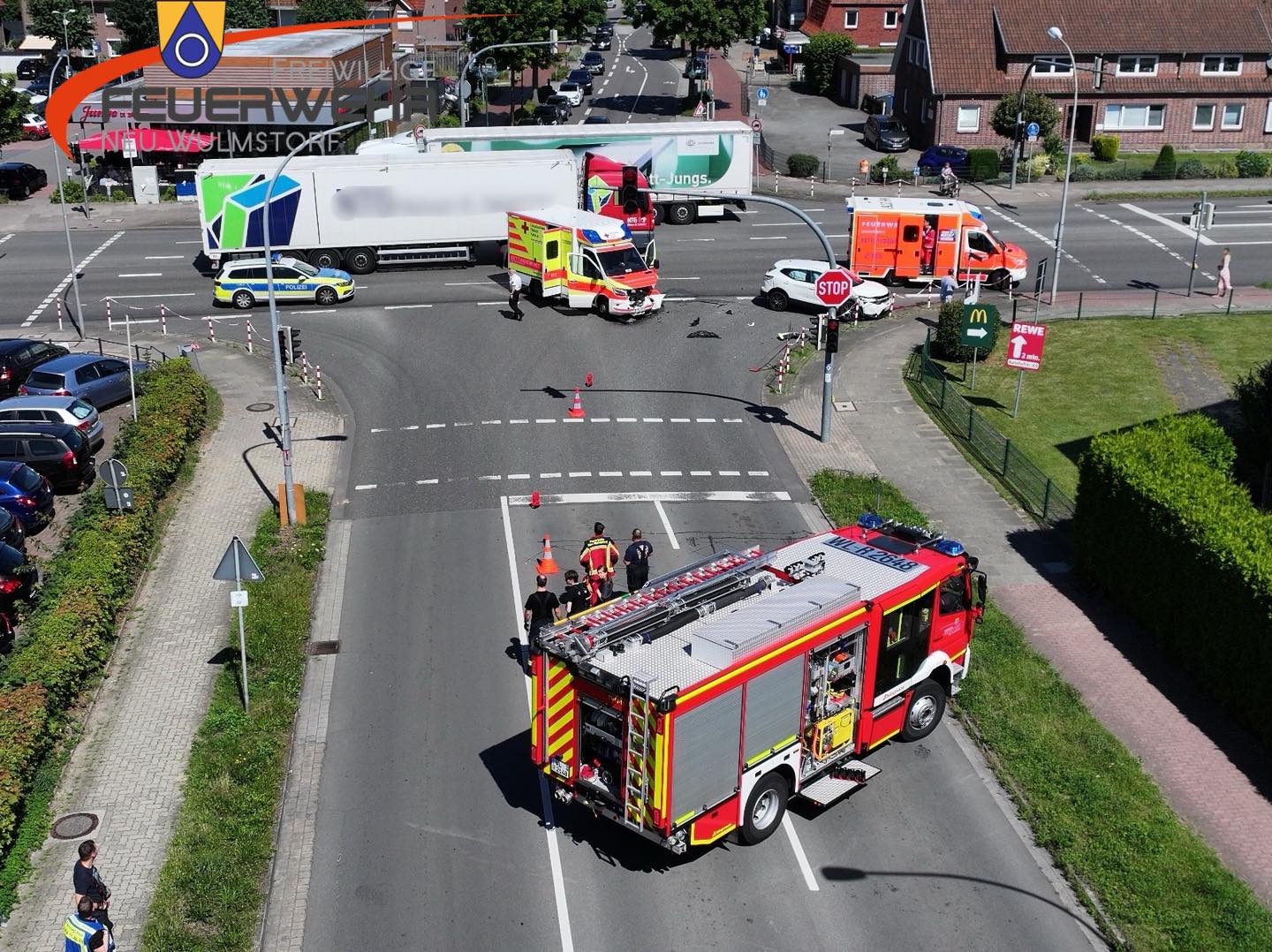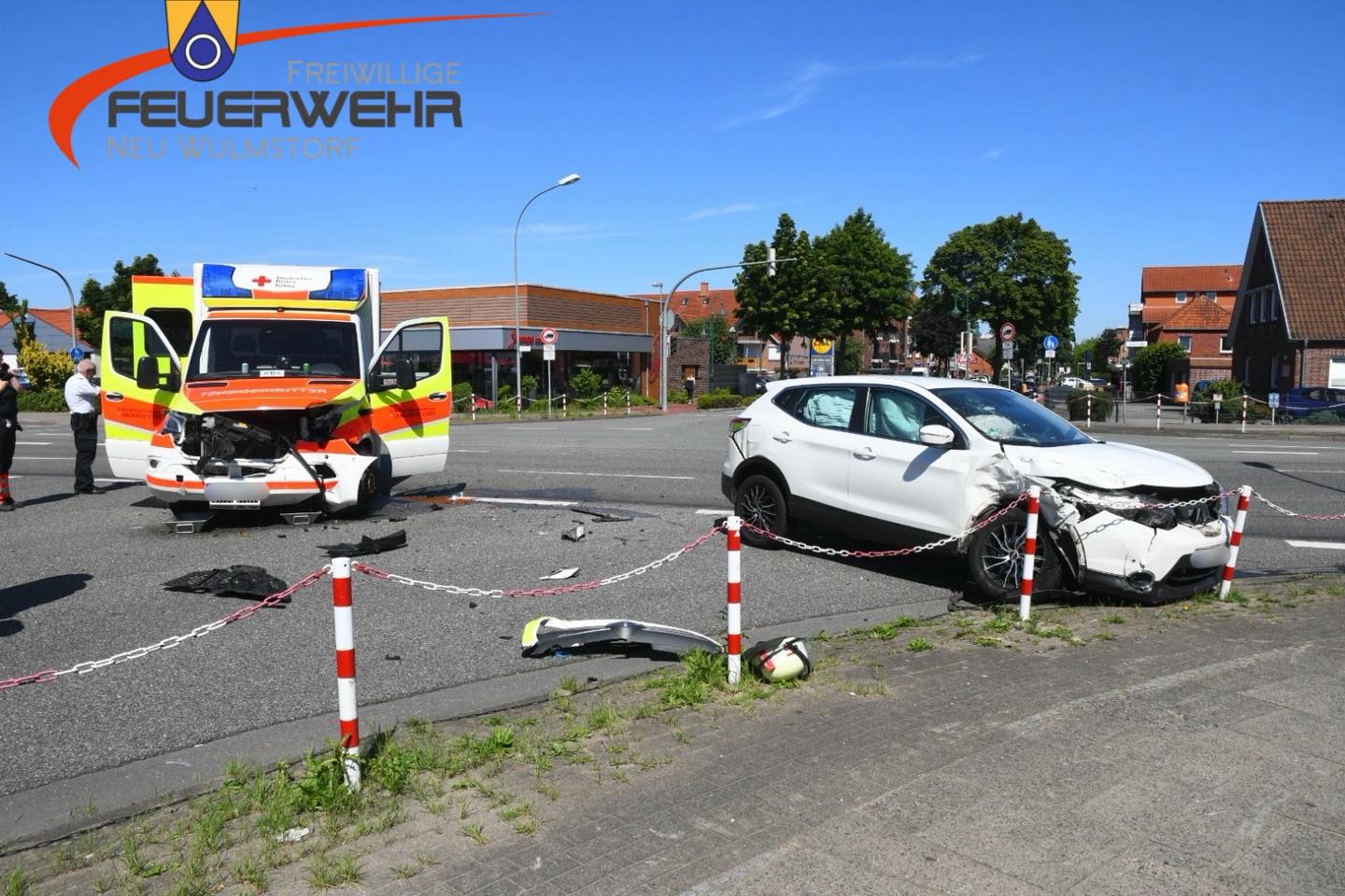 Bereits am 30.06. kam es auf der Kreuzung Hauptstraße Ecke Bahnhofstraße/Wulmstorferstraße zu einem Unfall zwischen einem Rettungswagen und einem PKW. Eine Person wurde dabei leicht verletzt.